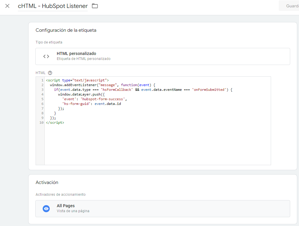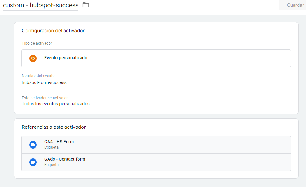Ahora que has configurado el tag y la variable, el siguiente paso es crear un trigger personalizado que se active cuando se detecte el evento hubspot-form-success.