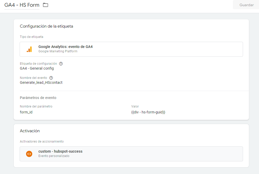 form_idy asígnale la variableHS Form ID. - Configura el tag para que se active con el trigger HubSpot Form Success.