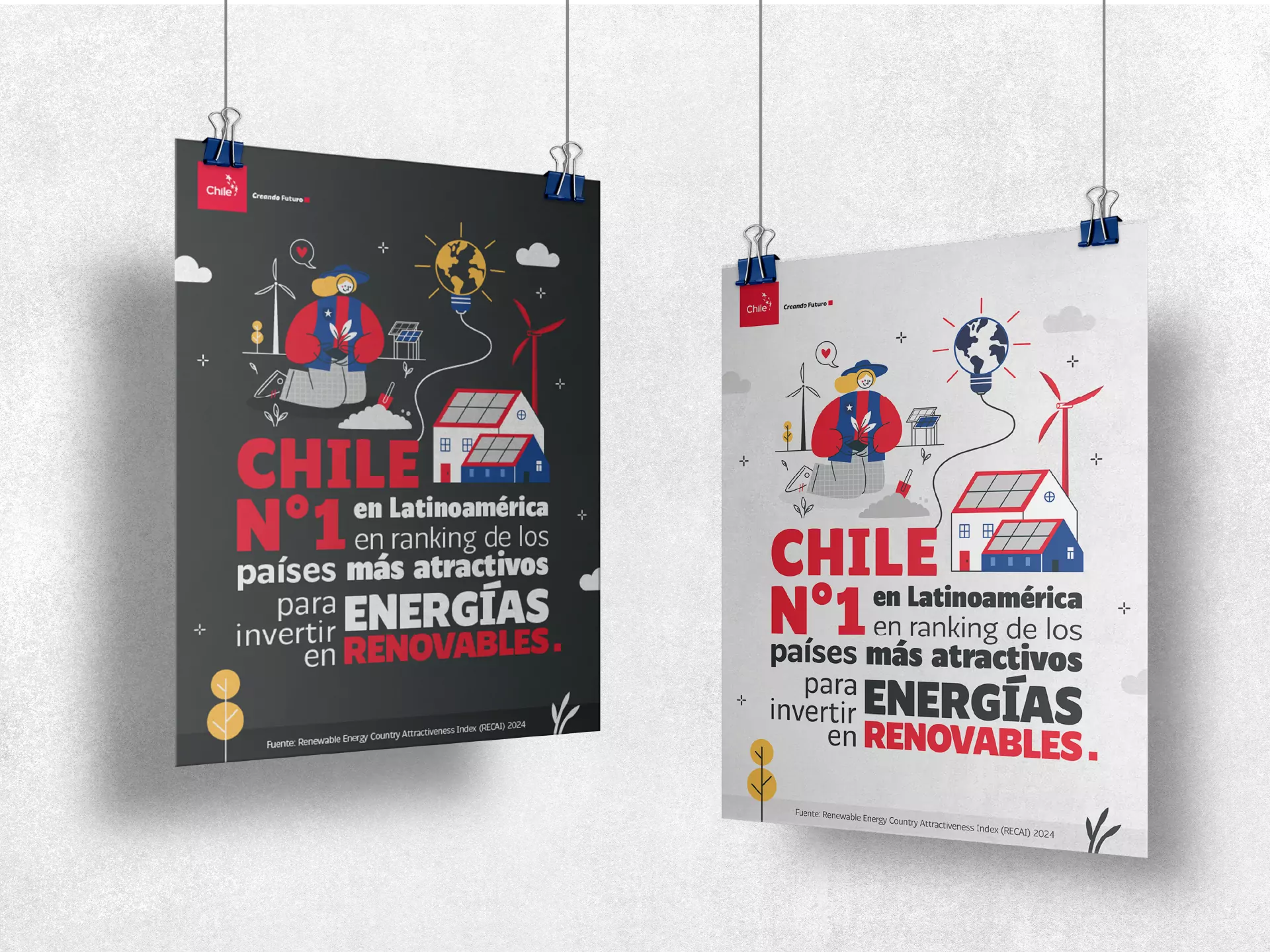 Para esta propuesta creativa se desarrollaron dos infografías estilo póster, enfocadas en transmitir de forma visual y sintética atributos diferenciadores de Chile. La primera pieza resalta el liderazgo del país en energías limpias, comunicando el concepto “Chile N°1 en Latinoamérica” en el ranking de los países más atractivos para invertir en energías renovables. El diseño usa íconos claros y paletas contrastantes para reforzar el mensaje de innovación y sostenibilidad.