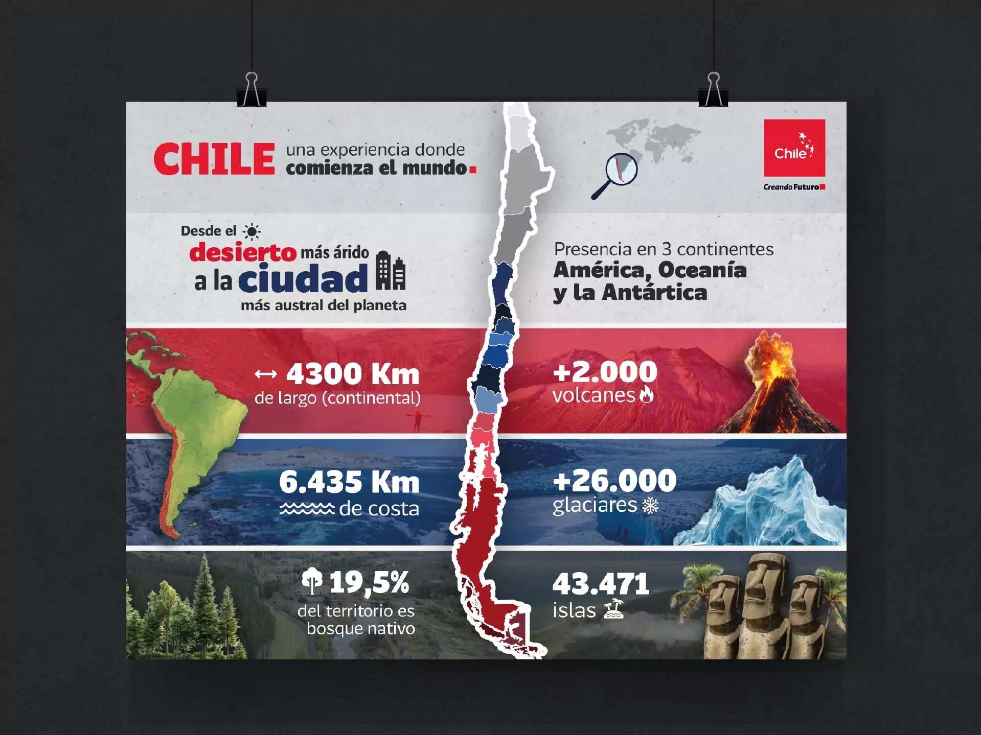 La segunda infografía presenta a Chile como un territorio de extremos y diversidad, bajo el concepto “una experiencia donde comienza el mundo”. Destaca hitos como su longitud continental, la variedad climática desde el desierto más árido a glaciares, sus más de 2.000 volcanes, miles de islas y la presencia en tres continentes. La propuesta busca generar orgullo nacional y atractivo internacional, combinando datos llamativos con un lenguaje gráfico claro y atractivo.
